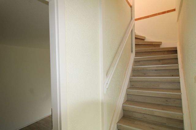 Das moderne Badezimmer bietet eine bodentiefe Dusche, eine großzügige Eckbadewanne, ein Pissoir sowie Fußbodenheizung. Vom Wohnzimmer aus erreichen Sie die beheizbare Garage mit hohem Sektionaltor, ideal für größere Fahrzeuge. Der Hauswirtschaftsraum ist gefliest und mit Wasser-, Abwasser- und Starkstromanschluss ausgestattet. Auch der Flur ist gefliest. Die Elektrik stammt aus 2002, ein Gasanschluss ist vorhanden, die Heizung wurde 2018 erneuert und die Fenster wurden 2007 teilweise ausgetauscht.