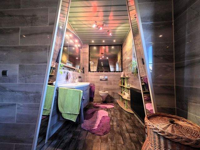 Das Badezimmer mit ca. 14 m² bietet eine hochwertige Ausstattung und eine außergewöhnliche Raumwirkung. Die halbrunde Duschwand aus dekorativen Glasbausteinen bildet ein besonderes Gestaltungselement, das durch Struktur und Lichtbrechung Akzente setzt. Eine große Badewanne, elegante Fliesen und ein großes Fenster mit Tageslicht sorgen für ein angenehmes Wellnessambiente.