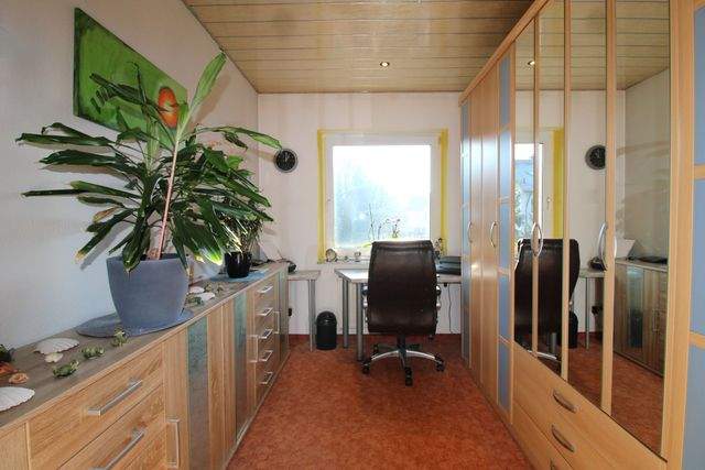 Über das gepflegte Treppenhaus gelangen Sie in das Obergeschoss. Hier stehen Ihnen drei weitere Räume zur Verfügung: Ein ca. 10 m² großes Arbeitszimmer mit Blick in den Garten, dass sich ideal für Homeoffice, Hobby oder Gäste eignet; sowie das großzügige Schlafzimmer, das durch seine klare Struktur und freundliche Gestaltung eine angenehme Ruhe ausstrahlt. Die große Balkontür öffnet den Raum zu einem nach Süden ausgerichteten Balkon, dessen Bodenbelag aus langlebigen WPC-Dielen besteht und zum entspannten Verweilen einlädt.