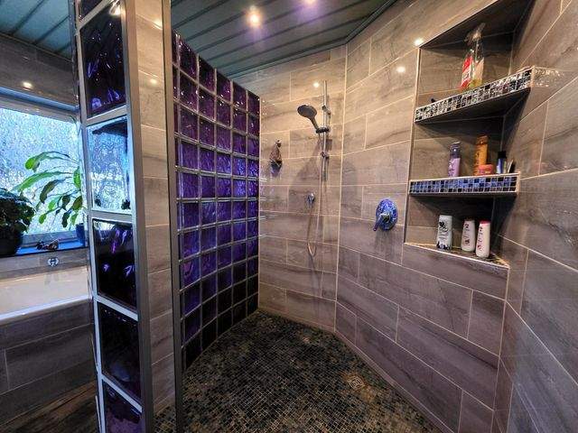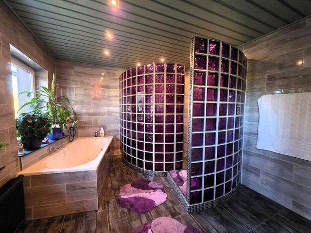- Großes Bad mit dekorativer Glasbausteindusche und Wanne