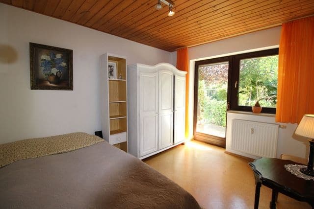 Das Badezimmer im Erdgeschoss ist hell und freundlich gefliest, großzügig geschnitten und mit Dusche, Badewanne sowie einem Waschmaschinenanschluss ausgestattet. Das Schlafzimmer überzeugt mit einer angenehmen Größe, Korkboden und direktem Zugang zur Terrasse. Ein weiteres Zimmer eignet sich perfekt als Kinder-, Gäste- oder Arbeitszimmer und bietet ebenfalls eine wohnliche Atmosphäre.