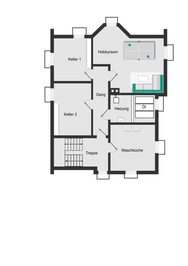 Im Kellergeschoss finden sich eine großzügige Waschküche, Lagerräume, ein Heizungsraum sowie ein vielseitig nutzbarer Hobbyraum, der sich als Werkstatt, Fitnessbereich oder Spielzimmer anbietet. Die geflieste Treppe sorgt für eine pflegeleichte und langlebige Nutzung.