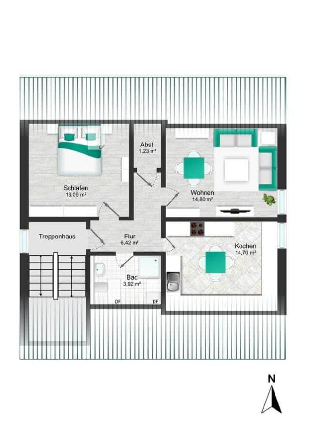 Die Wohnung liegt im Dachgeschoss im dritten Obergeschoss und bietet auf etwa 55 Quadratmetern Wohnfläche ein gemütliches Zuhause, das sich ideal für Singles, Paare oder Kapitalanleger eignet. Der Grundriss ist funktional gestaltet und ermöglicht eine vielseitige Nutzung der Räume. Das großzügige Schlafzimmer bietet ausreichend Platz für ein großes Bett und Schrankelemente und schafft einen idealen Rückzugsort. Die große Küche ist ein zentrales Highlight der Wohnung. Sie bietet nicht nur viel Raum für gemeinsames Kochen und Essen, sondern ist bereits mit einer modernen Einbauküche ausgestattet, die im Kaufpreis enthalten ist.