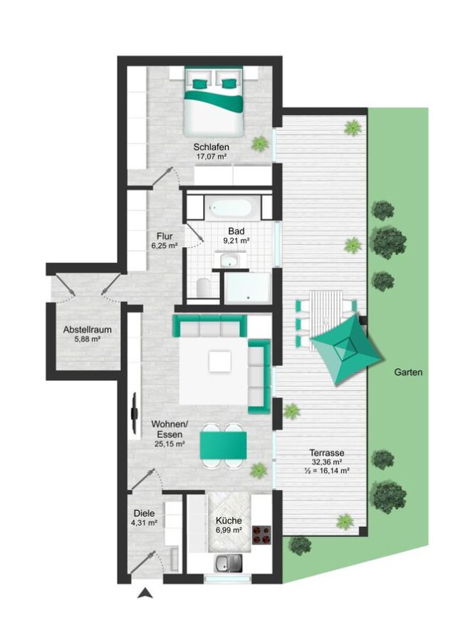 Die Wohnung besticht durch ihre durchdachte Raumaufteilung und helle Atmosphäre. Herzstück ist der offen gestaltete Wohn-Essbereich mit Zugang zur rund 32 m² großen, überdachten Terrasse - ein echtes Highlight mit Blick ins Grüne. Das Schlafzimmer bietet ebenfalls direkten Zugang zur Terrasse, wodurch sich ein angenehmer Übergang von innen nach außen ergibt.